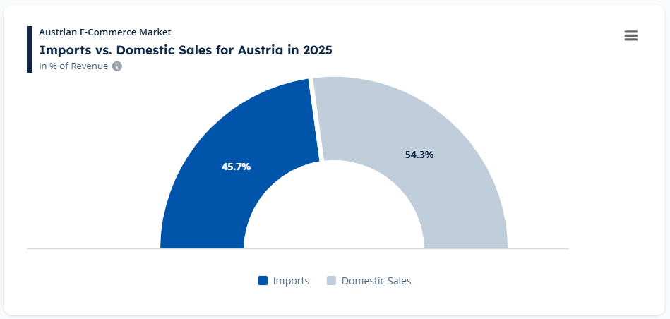 This cross-border behavior is also visible in import patterns. In 2025, roughly 45.7% of e-commerce revenue in Austria came from imported goods, while domestic retailers accounted for about 54.3%.