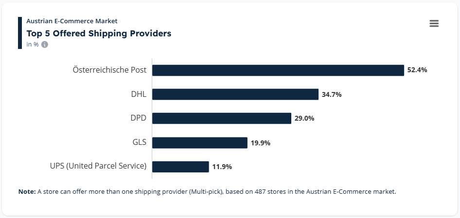 Among them, Österreichische Post plays the largest role. The national postal operator handles roughly 52.4% of e-commerce shipments, making it the backbone of Austria’s parcel delivery ecosystem.