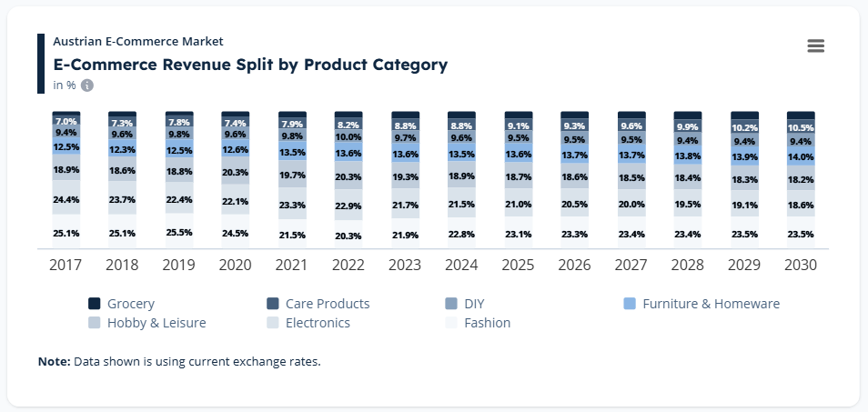 Fashion and electronics remain particularly influential. Fashion alone account for roughly 20–23% of e-commerce revenue, making it one of the most significant categories in Austria’s online market.