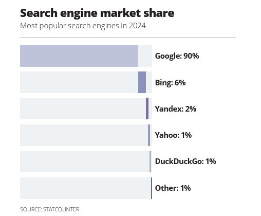 In Germany, search is still dominated by one player. Google keeps around 90% market share, with Bing at about 6% and the rest split between smaller engines. So when you plan SEO or retail media, search is still heavily Google-centric.