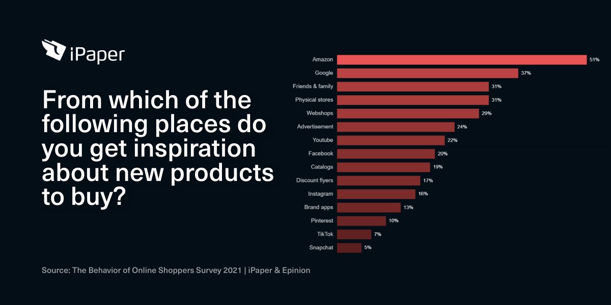A majority of shoppers (51%) stated that Amazon was the market leader for online inspiration. Amazon was also a preferred destination for product search and purchases. A huge 60% of shoppers use Amazon to buy products, compared to only 24% for webshops.