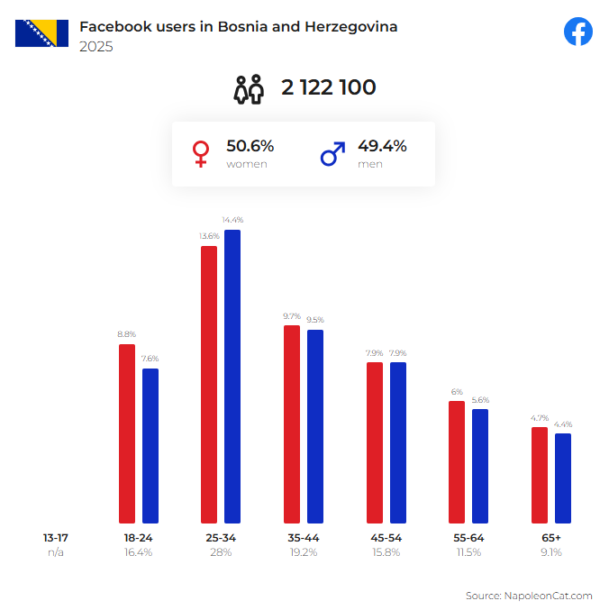 TikTok is growing quickly and isn’t to be underestimated. TikTok had 1.08 million users aged 18 and above in Bosnia and Herzegovina in late 2025, reaching 41% of all adults in the country. The platform skews slightly male (56.6%) and is growing at a fast clip — TikTok’s potential ad reach in Bosnia and Herzegovina increased by 9.5% between the end of 2024 and late 2025.