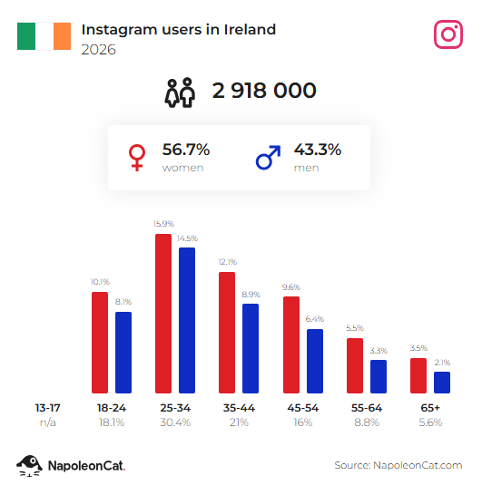 Instagram has grown to 2,966,700 users in Ireland as of February 2026, representing 57% of the total population, with women making up 56.5% of the platform’s Irish audience, making it a powerful channel for visual commerce and product discovery.