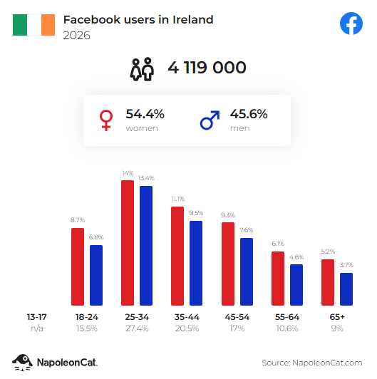 Facebook remains the most-used social platform in Ireland, with 4,119,000 users as of February 2026, accounting for a remarkable 79.1% of the entire Irish population, making it still the single biggest digital audience any brand can tap into.