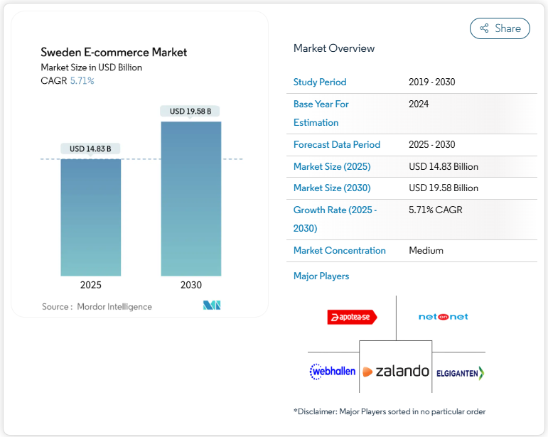 Sweden’s e-commerce market is on track to hit an impressive $14.83 billion in revenue. And it doesn’t stop there! The market is expected to grow steadily by 5.71% to 2030, reaching a whopping $19.58 billion. A surge like this reflects the changing nature of online shopping in Sweden and positions it as one of the most interesting players in the global e-commerce scene.