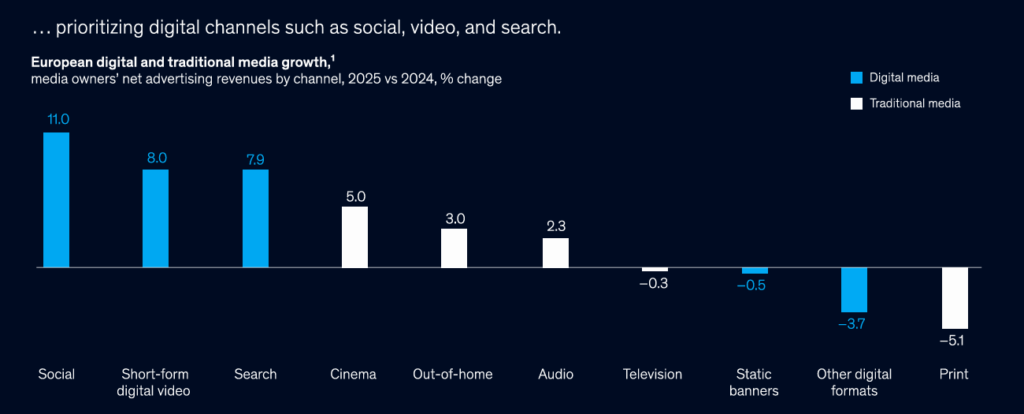 The expected growth is led by social (+11.0%), followed by short-form video (+8.0%), and search (+7.9%). This is a clean planning signal for marketing in Europe: marketers are following attention patterns. Social and short-form video also push brands to communicate fast and clearly. If you can’t earn attention in two seconds, you don’t get the next five.
