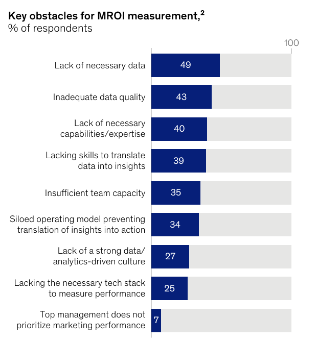 The biggest obstacles include lack of necessary data (49%), inadequate data quality (43%), lack of capabilities or expertise (40%), and lack of skills to translate data into insights (39%). These are not exciting problems. They still decide if your ROI program works.