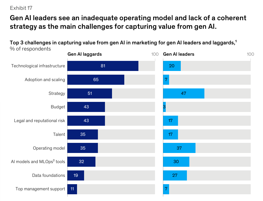 Even basics like technological infrastructure (81%) and adoption and scaling (65%) can block you. On the other hand, leaders cite harder problems like strategy (47%) and operating model (37%). Same tech, different stage, different headaches.