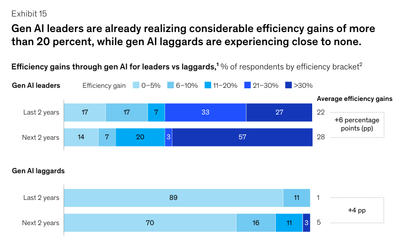 Gen AI is where the gap is widening fast. Only 6% are gen AI leaders, yet those leaders are already reporting 22% efficiency gains and projecting 28% more, with 57% expecting more than 30% gains.