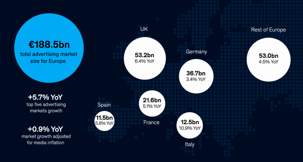Europe’s advertising market is expected to reach €188.5 billion in 2025. The top five markets are forecast to grow +5.1% year over year, and it’s Germany, UK, Spain, France, and Italy. Yet, the real growth is close to flat, because media inflation eats a lot of the nominal gain.