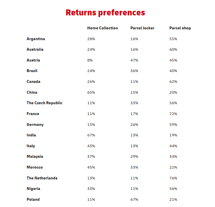 Returns behavior reveals real preferences faster than deliveries ever could. Across Europe, 53% of shoppers return items via parcel shops, while 26% use parcel lockers. Austria mirrors this pattern closely, with 45% choosing parcel shops and 47% lockers for returns!