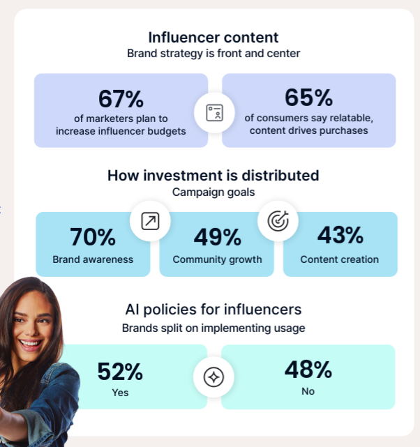 The structure of influencer programs reflects this shift. Brands lean heavily on micro and macro creators, with nearly half prioritizing each group. Micro creators bring trust, engagement, and niche depth. Macro creators bring awareness and cultural presence. Together, they create a layered approach that works across the funnel without forcing a single voice to do all the work.