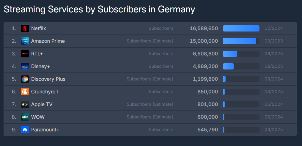 RTL+ is a uniquely German force among streaming services in DACH. Subscriber numbers in Germany place it firmly in the top tier locally. Its strength does not translate equally to Austria or Switzerland, where usage is far lower or absent.