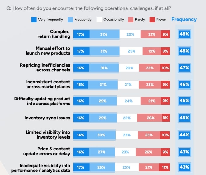 Inconsistency is one of the most frequent and most damaging problems for sellers. Almost half of all respondents experience mismatched content across marketplaces.