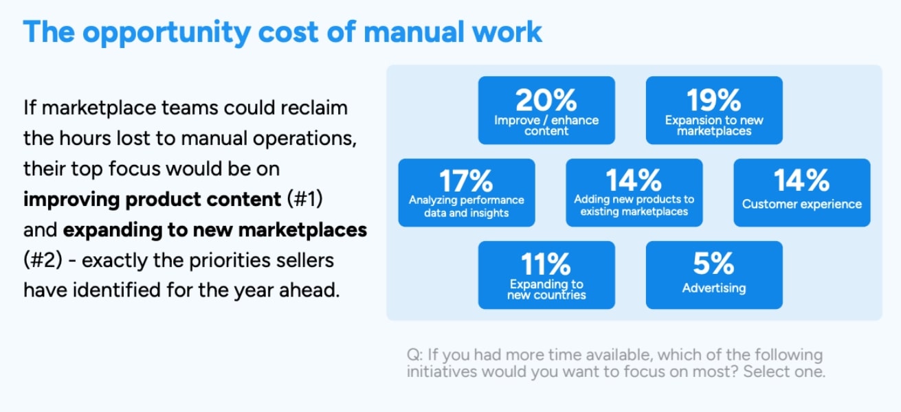 If marketplace teams could reclaim the hours lost to manual operations, their top focus would be on improving product content (20%) and expanding to new marketplaces (19%): exactly the priorities identified for the year ahead.
