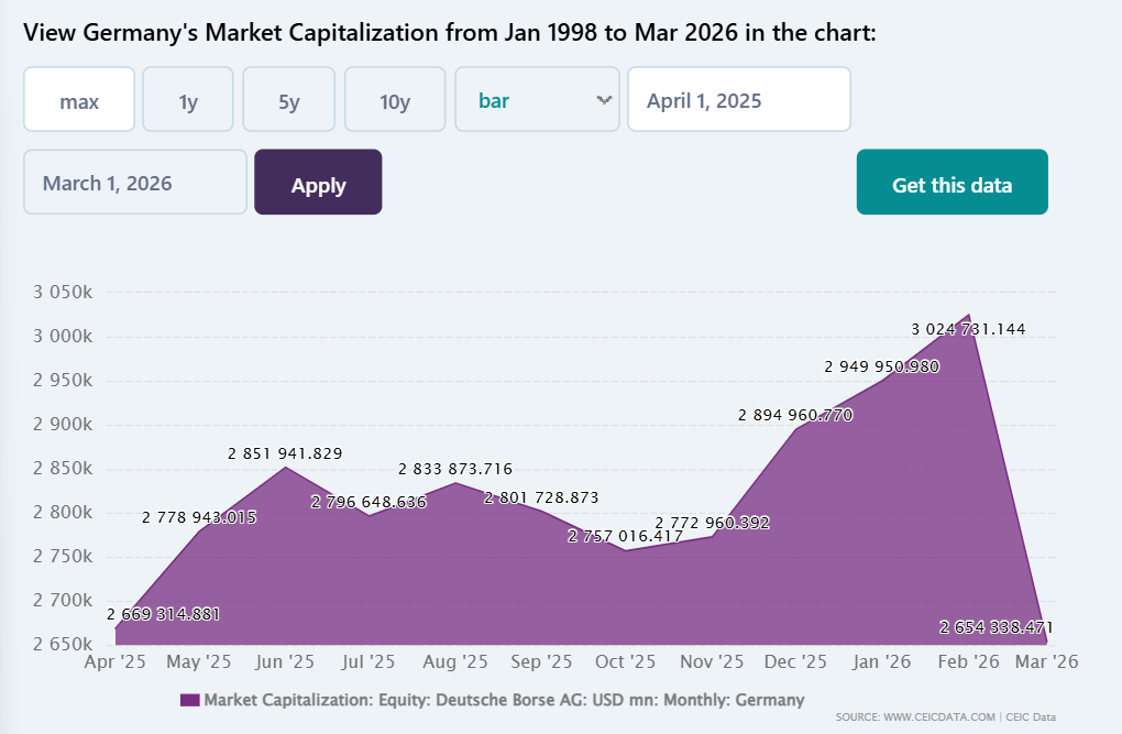 Germany’s market capitalization accounted for $2,654.338 bn in Mar 2026, and even more in February 2026 – an all-time high of $3,024.731 bn. Leading companies continue to play a pivotal role in this growth.