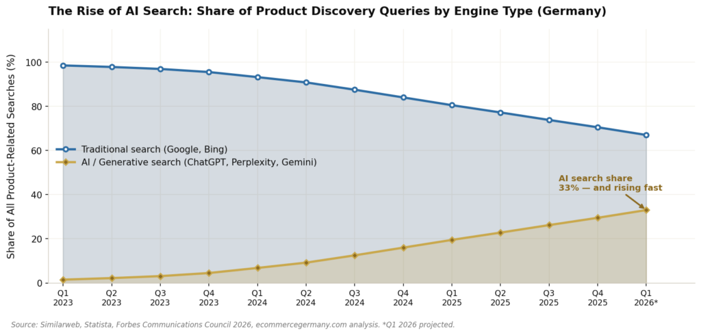 This is not a future scenario. ChatGPT Shopping launched in Germany in 2025, enabling direct product recommendations within the chat interface. Google’s AI Overviews are now appearing on a significant share of German product-related queries. Perplexity has established a meaningful user base among younger German consumers. The shift from traditional search to AI-assisted discovery is already underway — and accelerating.