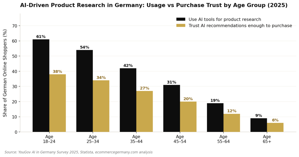 Germany is, characteristically, a nuanced market for this shift. German consumers have well-documented concerns about AI — with 81% advocating for clear labelling of AI-generated content in advertising. Trust in AI recommendations is lower among older demographics and higher among 18–34 year olds, who are already using AI tools as a primary research layer before any purchase.