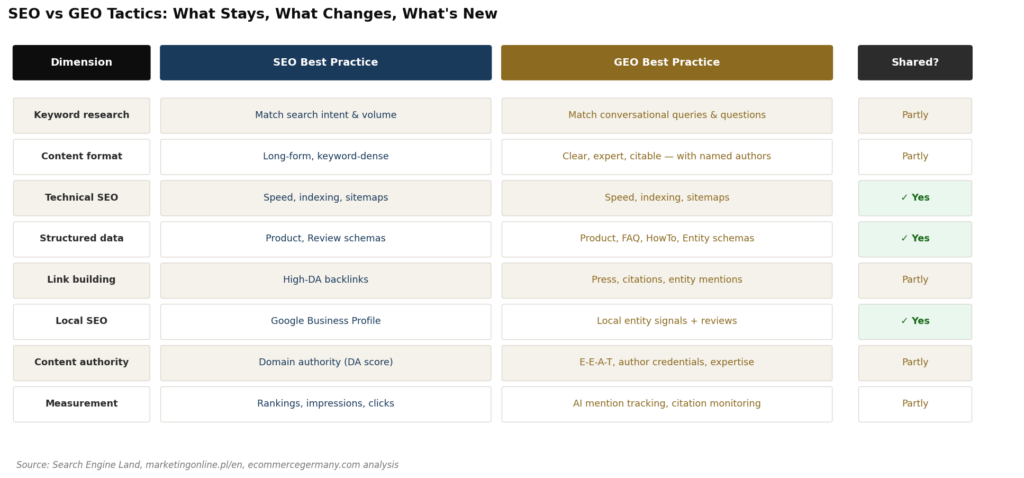 The comparison reveals both the continuity and the disruption. Several SEO fundamentals carry over directly — technical site health, page speed, Core Web Vitals, structured data, and local signals remain important in both paradigms. But the divergence in content strategy, authority signals, and measurement is substantial.